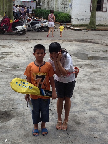 刚家访回来,就看到小朋友大海和队友郑莹坐在树荫底下聊天。
