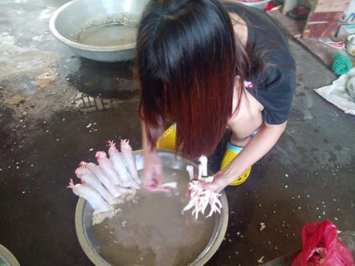 丽莎在一丝不苟地洗鸡头、鸡脖