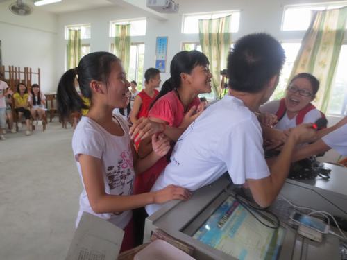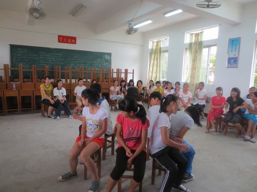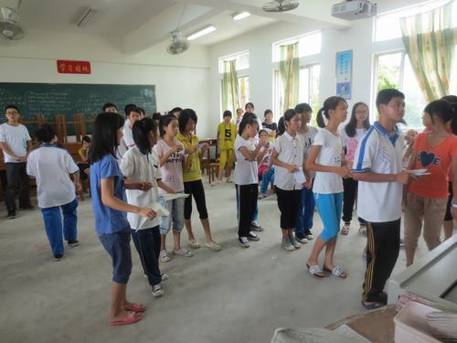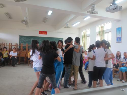 今天原本预定要举办一个定向越野的趣味运动会,但今天早上突然下起的大雨阻断了这一计划,我们只好改为在教室里和各位小朋友玩一些游戏。一开始还担心小朋友们会因此感到失望,不过后来看着孩子们比我们还有热情,还要更加积极,更加兴奋,我们的疑虑也就打消了。游戏于九点正式开始,先分成9个组,游戏是计分制的,首先被淘汰的加1分,最后胜利的加十分,分数高者就赢。首先进行的游戏是“抢凳子”。首先小朋友们绕着一个圈子慢慢转,后来转的圈子越来越小,越来越贴近椅子,且靠近椅子时走的速度慢,一离开椅子时走路速度又加快了。我看着看着,笑出了声,脑子里闪过了自己在曾经的某个时候和童年的朋友一起玩抢凳子的片段,那是我就是这种心理,总是希望自己能在一个最佳位置以最快的速度抢到椅子。