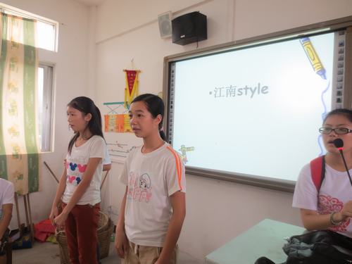 第三个游戏是“你画我猜”,这个游戏中小朋友们的表现略显矜持,感觉不太放得开,动作做得不够多,一旦遇到难于做动作的名词就会显得不知所措,猜词语的另一对同学似乎也不能很好地猜到他们做动作同学的意思。