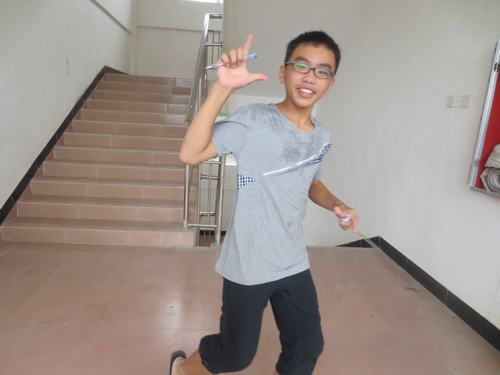 最后一个游戏是“找字母猜单词”,要求参赛者在整座教学楼找出九个英文字母,并把它们拼成一个英文单词,速度越快越高分。有一个字母贴在教室外面的一根柱子后面很少人发现。
