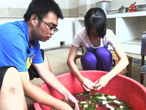 作为后勤组的一名女性成员,想象中的工作应该比较轻松。因为有很多男生在,那脏活累活想必都不用我们干。我们女同胞们的工作或许只剩下高贵的试菜和冷艳的派饭。事实证明,是我们想多了。因为男生们很多在其他组也有兼职,所以lady们买菜,洗菜,洗米,炒菜,样样都要做,提前做了黄脸婆。哎,不能说,说多了就都是血泪啊!