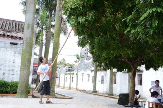 每天吃过晚饭以后,天气好的话,必进行的一项饭后活动就是摘龙眼。四、五个人一队,拿着摘龙眼专用的工具——改装过的竹棍——就摘起了龙眼。每天总有那么几个人非常喜欢摘龙眼,但是却不吃,而总有那么几个人一直在吃别人摘下的龙眼,自己却不摘,这大概是我见过最科学的工作模式了——有人摘,有人吃。