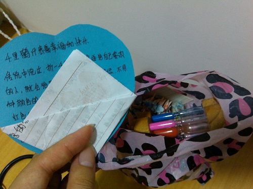 终于这孩子不哭了,而我也要赶紧把行李搬到车上去免得大家等。竟在路上见到了我的小大叮当——初二的孩子,拾娣。其实这最后一次见面只是我们见的第三面,她很安静、不怎么说话,从前她的光芒就好像被志媛的热情盖过了,我对她甚少关注。她送来一个小袋子说“这个送给你”,里面鼓鼓的、是什么我一下腾不出手来看个究竟,却被她这份突如其来的小礼物感动了,回以微笑,想着在车上静下来再细细看吧。她们俩送我到车边,给她们一起来了个三人抱之后,我坐上车,打开那个袋子——是一个沙漏和一整袋的小小的纸鹤!打开那封信,她竟回了我满满一页的信!还有那365只纸鹤,是在我们去的第一天就开始折的……泪水在眼里打转,心里被这些纸鹤掠过、掀起层层涟漪……
