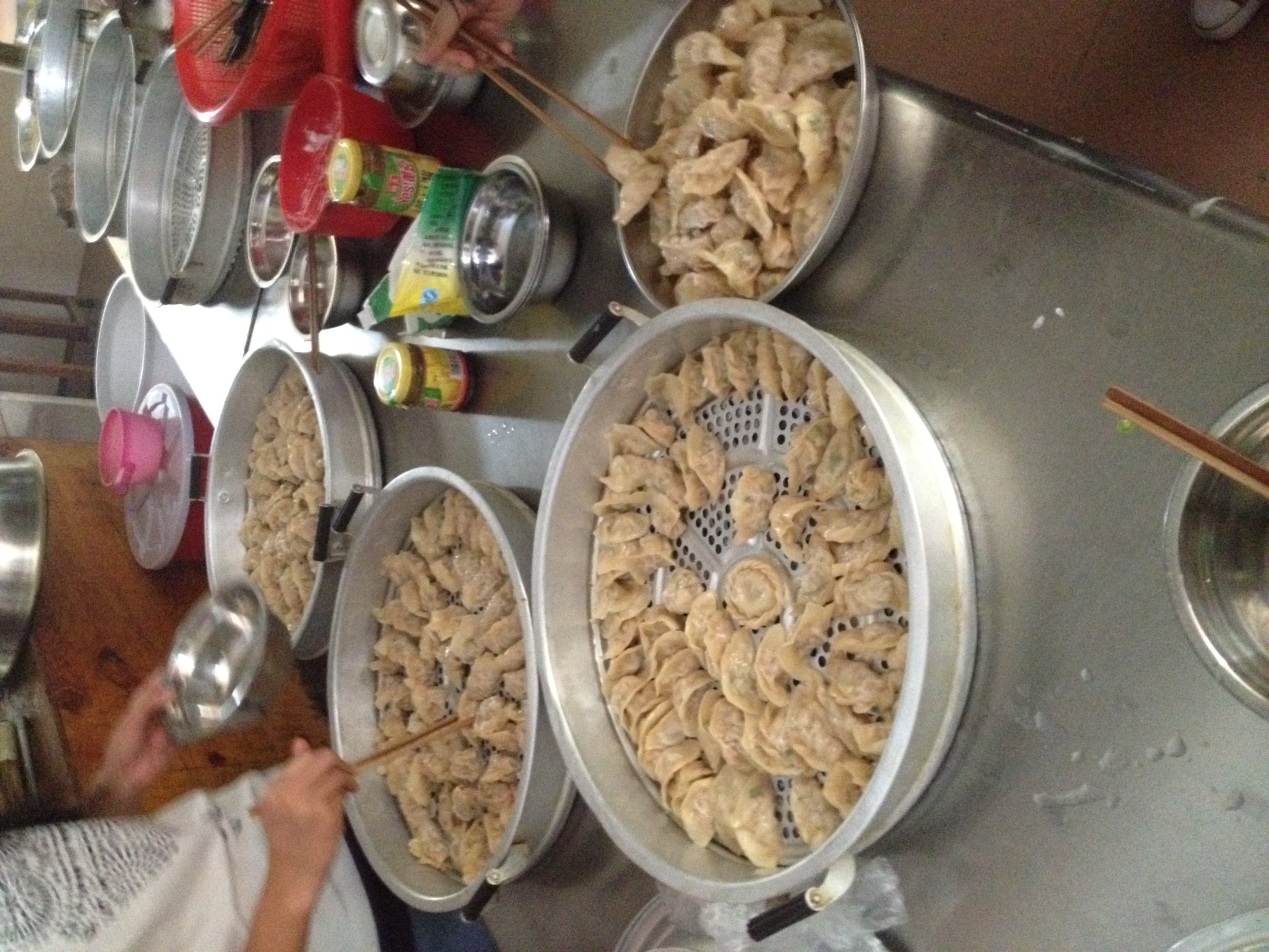 在后勤组组员把馅料和面粉和好后,最欢乐的包饺子时间终于到了,现在离开饭时间还有两个小时,厨房里很热闹,不仅后勤组在忙,义教组、调研组以及宣传组中闲着的同学也加入到了包饺子的大军中去。正如一句老话所言,人多力量大,很快他们就包好了两大笼饺子,而人多包出来的饺子也千奇百怪,有小笼包形、心形和馄饨形,正常形状的饺子却没有几个。心形的饺子大概是本次包饺子活动中最具浪漫色彩的食物了,因为这些饺子是“行义一夏”一对神仙眷侣为对方包的定情信物,幽默的是很多心形饺子都被不知情的同学大口吞下了。