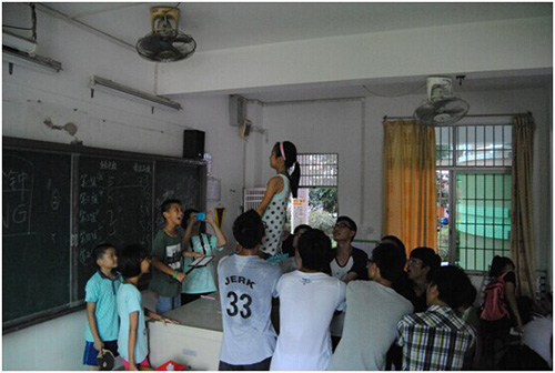 接着是信任背摔,它要求几个男生站在低处用手臂交叉形成一张网,小朋友则站在高处背对着倒下来。这个游戏看似简单,但玩起来需要极大地勇气。因为你背对众人倒下来,你不知道托住你的人是否会跟你恶作剧,故意松手让你摔在地上。因而,它考验的是人的胆量和信任。令人欣慰的是,小朋友们都很勇敢地站在讲台上,欢呼声和喝彩声充满整个教室。