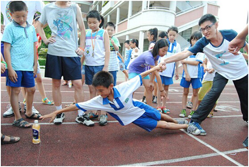 首先是伸手够水,它要求老师抓住学生,让学生在不超过线的情况下身体平躺下去拿到水瓶,这不仅考验着老师的臂力,更考验小朋友的勇气与毅力。一开始,我们组连战连捷,迅速追平前一组创下的最高纪录。但是,第一次尝试打破记录便以失败告终,正当记分员要记录的成绩时,我们组的一个小男孩小声地对我说,老师,我想再试一次。看着他坚毅的目光,我点点头。“来,抓紧我的手,脚伸直,手伸长,对!不要怕!”,在一片欢呼声中,男孩拿到了水瓶,跑过来跟我击掌相贺…