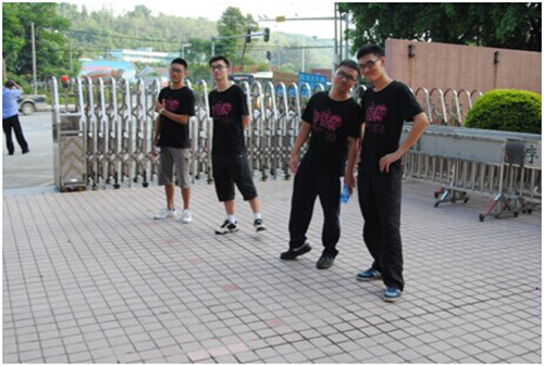 四位男生在门口迎接