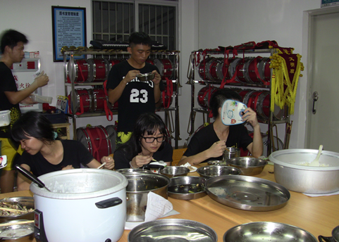 由于后勤组尚未对做饭一事上手,所以我们的晚饭比较晚开始。饭菜陆续从厨房被端到多功能室中。在多功能室里,热气腾腾,大家身处其中,如同焗桑拿一般;而在外边则像是天堂一样凉爽。一排的人其坐在外面吃饭,形成一道靓丽的风景线。我们从小伙伴们的精心准备的一餐中吃出了浓浓的努力的味道。这一餐,我们都吃得很开心。