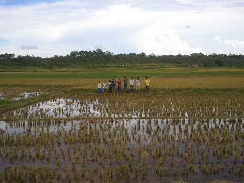 接着是特色镜头的拍摄。八九个活蹦乱跳的小男孩站成了一排,手拿着一根小稻穗在空中挥舞,果真是年少张狂呀!看他们那个青涩的模样,帅气逼人有没有?成强师兄拿着他心爱的吉他,坐在稻谷堆里弹唱《稻香》,那一脸自我陶醉的认真表情,霸气外露有没有?还有小孩子折了小船在小河里放,勾起了我们这些大孩子的童年记忆有没有?他们坐在稻田边上清唱《稻香》,青春无敌、羡煞旁人有没有?最后我们还一起拍了个三三两两在路上飞奔的场景,纪念我们的青春年华,纪念我们“大小叮铛”真挚的友谊……