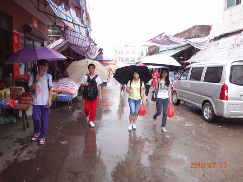 上完课,我就和后勤组的一起去市场采购,顺便买一些明天上“生活百科”用到的“道具”——零食,因为我明天要教学生们看零食上的营养成分表,从而可以学会买一些健康的零食。这是我第二次去市场,又是一个下雨天,又在路上碰到了心理班的同学在做调研。市场上的人似乎比上一次来的时候少了很多,但我们买的蔬菜还是一打一打的。庆幸的是,菜档的老板娘不仅告诉我们一些市场上的基本情况,比如说哪里的菜会便宜一点,哪里的菜会好吃一点之类的;还答应给我们送货到学校,所以我么在冒雨回学校的途中才可以这么潇洒。