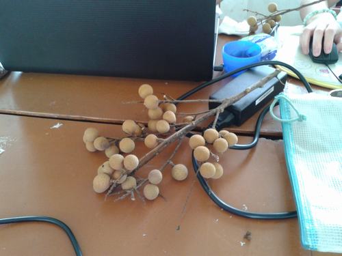 经历了早上的暴风雨后,下午的天气好得无法让人对它早上的所作所为生气。一路上水汽若有若无,雨后的凉风似乎还没被下午的骄阳完全驱赶。下午气温又开始上升了。让我们的精神为之一振的就是学生们送来的新鲜的龙眼。好吧,各种赞叹我们都表达过了。真的是千言万语一句话:甜到入心。