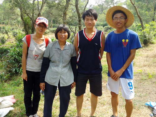 接着,华师傅带我们参观并讲解了茶叶的制作过程。茶叶从鲜叶到最后的成品需要经历筛选、萎凋、揉捻、发酵、烘干等过程,每一过程都有严格的技术要求,比如,发酵温度应该控制在25—28度。 当我们提及今天上午寻找茶园而不得的经历时,华师傅愉快地提出充当我们的向导带我们参观如何采茶。于是我们顶着烈日再次走向上山的道路。我们来到茶园,华师傅告诉我们为了满足水热需求,这里的茶树独特之处是和相思树间隔种在一起的。恰巧,山上很多阿姨正准备采茶,我们很荣幸地邀请其中的一位姓林的阿姨为我们展示如何快速地采摘茶叶,只见阿姨眼到手到,两只手就像机器手一样快速地运转起来,其速度之快,采摘之准,不是一时半会可以练就的。据了解,林阿姨今年58岁了,采了三十几年的茶叶了。