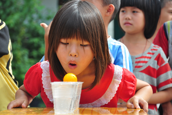 对于吹乒乓球这样从来没有玩过的游戏,孩子们既好奇,有兴奋。6个装满水的水杯整整齐齐的摆在桌子上,要求将放在第一个水杯的乒乓球吹到第六个水杯中,不能掉下。看着三排桌子,每排六个水杯的阵容,每个孩子都跃跃欲试,激动不已,每个组的五个人每个人要在最短的时间里完成任务才能算游戏结束。三个组立马展开吹乒乓球大战,有的孩子试了好几次才最终将乒乓球吹到最后一个水杯中,有几个孩子则特别厉害,一次性成功,用时仅为2秒!专注、安静,如果要让这些孩子在课堂中做到的话,激起困难,但是在这样吵闹的场合下,孩子们却静的无声,都想着最快的把球送到最后的杯子中,任凭杯中的水怎样的溅湿他们的衣服和鞋子。最后,第一小组以1分40秒的飞速获得胜利。游戏结束了,但是孩子们还是依然轮着吹乒乓球,一直在玩。或许他们是在寻找着某种技巧让球在最短的时间到达它的目的地。