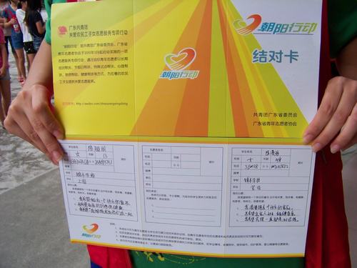 “朝阳快乐营”活动是霖磐镇的传统夏令营活动,目的是让大学生与农民子弟手牵手,走进大学、走进城市、走近科技,以此激励农民子弟积极向上。在这个活动中,一名三下乡志愿者与两名小朋友配对,填写好“朝阳行动结对卡”后,我们的素拓活动就正式开始了。