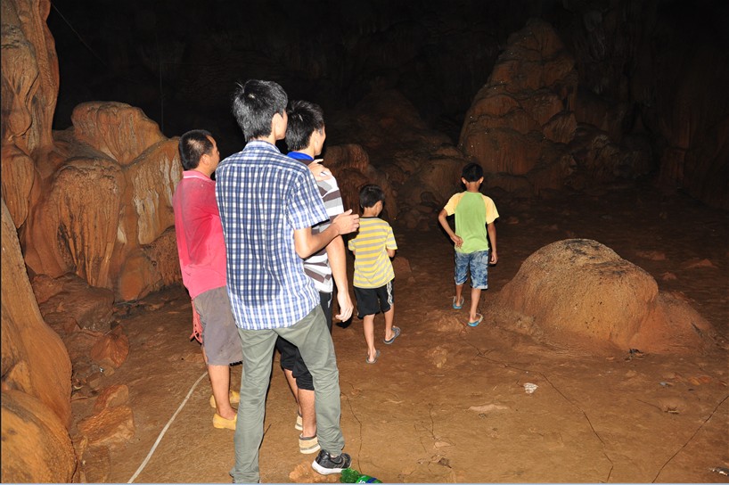 在我们一句句:“还有多久就到啊?”和村民的那一句句:“不远,就到了,很容易到的”的回答中走了将近一个钟才看到朴实无华的洞口。回头看一看,跌跌撞撞的爬上来,说不出的辛苦和艰难啊!感叹感叹!没想到竟然是那么小的一个洞口,和我想象的那个宏观殿堂般的山洞口差那么远。就在我们缓缓靠近的洞口的时候,我的心真是爽到爆了,那跟空调一般的冷气吹打在身上的时候,真是舒服到不行了。沉浸在凉爽的空气无法自拔,慢慢回头才看到洞口旁边的养羊屋和啊叔。他热情的招待我们,还跟我们介绍那里的情况,拿着手电筒带着我们进山洞。不进不知道,一进吓一跳,原来里面别有洞天,曾经抗战期间几千村民都躲在里面避难,一层又一层的石洞错综复杂,就算是当地村民一不小心都可能在黑乎乎的石洞里迷路。看着里面闪闪发光的石头,就像洒满金粉一样勾起我们的好奇心。看着里面奇鳞怪状的石头就想进去探险,在村民的一再劝告下,我们在和村民了解了一下情况后就下山了。
