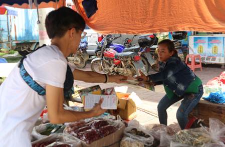 最后是社工组的同学们。今天恰好是大洞镇的圩日,大山群抱中的大洞镇难得像今天那样的热闹。许多人都出来赶集,喧嚣的市场为平日略显冷清的街道注入了活力。社工组的同学们,在当地计生办的工作人员的带领下,帮助开展了食品安全,计生政策等组的成员时而穿梭其中,时而伫立在旁,派着传单,讲着宣传口号:“您好,我们是广东外语外贸大学的同学......”尤其是社工组的组员陈钰龙同学,身上的衣服早已被汗水淌湿,但仍旧不撑伞休息。身为15心理的体育委员,他诠释了我们本次“有心人”服务队的精神内涵。