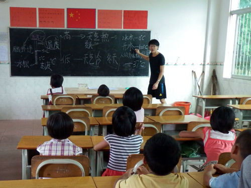 “今天是第二堂思想品德课,过了很久才让孩子们安静下来,在讲了两篇关于诚实的故事后,孩子们似乎又变的不安分起来了,直接说:‘不想听故事啦!’我无奈又无助,思想品德不是应该用过故事来延伸城市的内涵吗?幸好,我有拿出一个预备方案:通过唱一些关于诚实的歌来吸引孩子们的注意力,于是我把《小小蜡笔》教了三遍,但是之后孩子们又不耐烦了,后面的四个小男孩又吵闹起来,甚至把书全部弄倒,我发怒了,把他们发在最后一排站得齐齐的,过了十几分钟后,再让他们回到座位上,这次终于安静下来了。宝英又给孩子们玩游戏,输的被罚唱歌,看着最后这几分钟孩子们的表演以及课堂的安静,我感到非常欣慰,非常开心。这是我多么渴望得到的效果啊!也许孩子们长大后,他们才会懂得什么是值得回忆的东西。虽然现在很调皮,但是我相信以后他们会更加听话的。我会不断的和他们聊天,我会改变他们的!加油!”