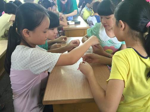 上课前老师和助教们已经做好了课前准备,上课一开始小朋友们就拿出在家事先准备好的各式各样的盒子,一脸期待的等待着老师过来分发珠子。一切前期准备工作完成后,手工课终于开始,除了小朋友们加入了这门课程,很多旁听老师也是跃跃欲试,开始了他们人生的第一节编织课,接着老师就就将全班分成了五组,分别由各个助教负责。