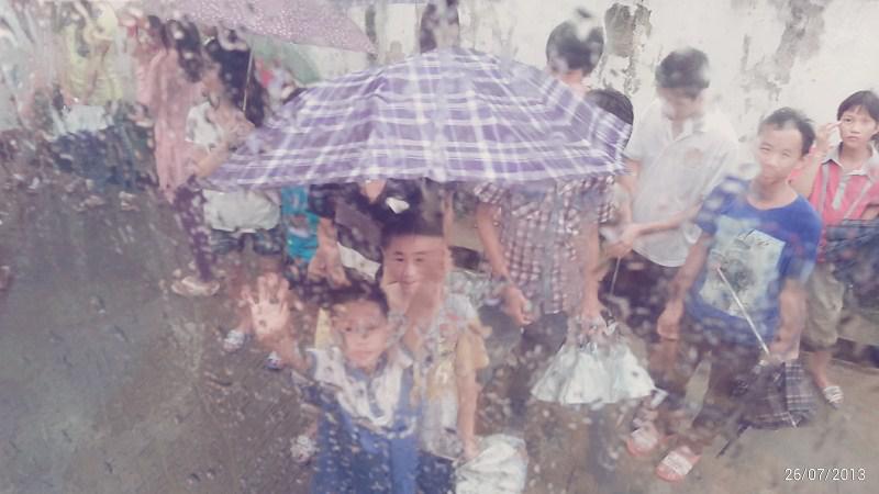图:小朋友们冒着大雨在车窗外向我们挥手