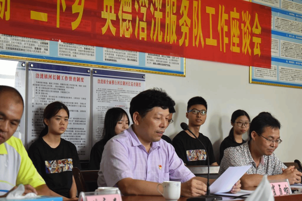 广东外语外贸大学2018年暑期“三下乡”英德浛洸服务队工作座谈会由浛洸镇党委书记肖贞响主持,参加座谈会的嘉宾有广东外语外贸大学校长石佑启、校团委书记苏奕、社会与公共管理学院党委书记高云坚、社会与公共管理学院院长彭未名、校团委社会实践部部长刘茹楠、社会与公共管理学院团委书记房瑞佳,还有英德市教育局梁振列、英德市浛洸镇党委书记肖贞响等英德市领导。