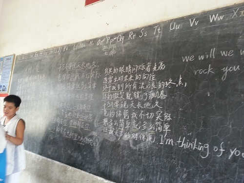 三班班歌“大村小爱”的板书,孩子们的歌声嘹亮且认真。