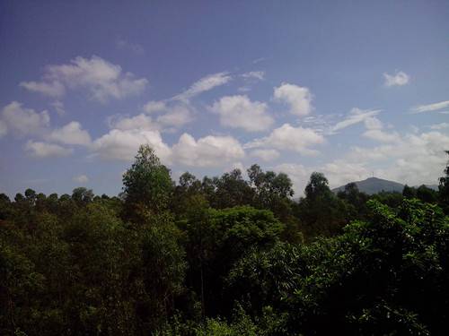 这是从睡觉的课室的窗户看出去的风景。室内或人声鼎沸或安静得只听到呼吸声,窗外,不因这眼前的喧腾而有丝毫的变脸,只一贯演绎着她的悠闲、恬淡。你看,树梢悄悄抚摸着天空的脸庞;你听,风中是不是有多少情话。这一刻,它们在我心中全都活了起来。说什么草木无情,其实有时候最无情的倒是我们自诩聪明的人类了。