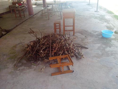 每天我们就要从这一堆乱柴岗里折柴来烧,平均一顿大概会需要3箩筐左右。