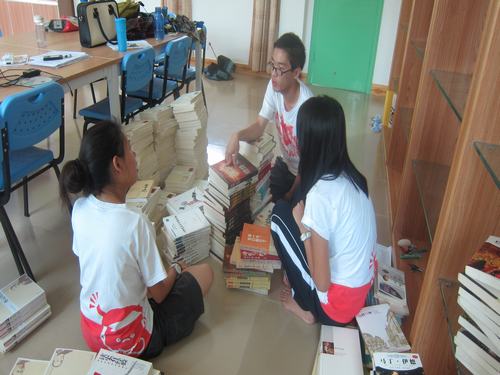 下午,同学们开始为每一本书贴上标签、上架。由于我们没有专业的机器,所以所有的标签都是由同学们亲手写上去的,一个同学对着编码报书名,一位同学负责找出那本书,一位同学负责写标签,两位同学负责贴标签。由于工作量巨大,这项工作一直持续到深夜才把所有图书的标签都贴完。