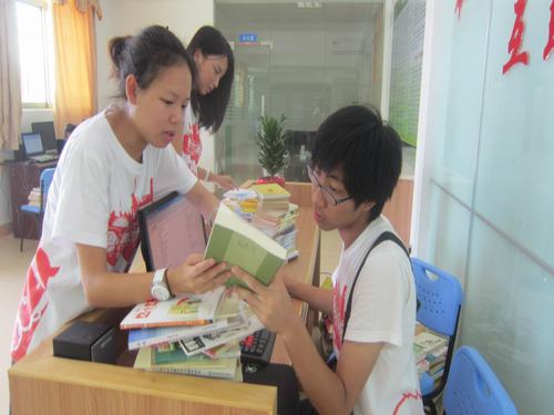 7月19日,11社工“扬爱义夏”服务队调研组的同学张智聪、黄静仪、区敏慧等一行人在副队长吴晓燕的带领下在霖磐志愿者服务站进行新购图书分类的工作。