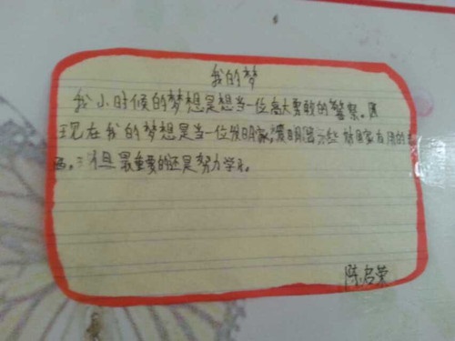 除了一帮让人又爱又恨的队友之外,还有一群可爱的小叮当,下乡的日子自不会单调的。印象深刻的,是孩子们的梦想。有人说想当科学家,有人说想考上大学,还有人说想有自己的一台电脑,很多孩子的梦想,我们已经做到。看到此时的他们,不免想起小时的自己。那时的自己也应该有着许多梦想、幻想,不知为何,越长大越茫然,是我们太轻易选择放弃了么?总之,看到那些写在纸上的不甚成熟的字迹,我知道那是最初的梦想,那是属于孩子最珍贵的东西。也许,偶尔孩子气一点,未尝不是对自己的一种宽待。我想,我们也需要时间,写写我们自己的梦想了吧。