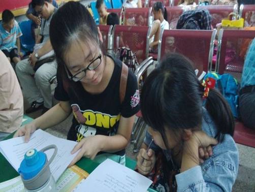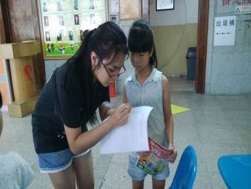调研组组员曹佩耐心回答二年级小妹妹填写问卷时的疑惑