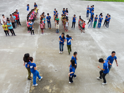 接下来是阳光翼旅给田心小学的可爱的学生们准备的“见面礼”。由我们全体队员——支教组、调研组、后勤组、策划组以及宣传组先后展示了大家为此次开学典礼精心准备的节目!支教组首先来了一段精彩的串烧童谣歌舞,调研组颇有心思的手语加上独特风趣的舞蹈博得了全场的哈哈大笑,后勤组的噼里啪啦舞以及策划组的合唱也是不可错过的亮点,最后,宣传组以猜童谣游戏配合击鼓传帽的形式实现有效的互动,并把全场气氛推向高潮,猜对了的固然有奖,猜错了也不会空手而归……其乐融融。