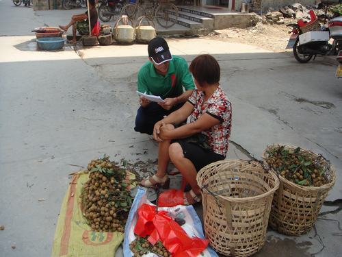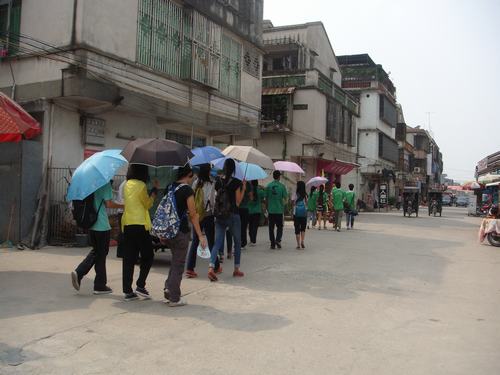于是我们走进了市集里面做问卷,但是效果也不明显。原因有三:一是我们来的时间是繁忙时期,大家不大有空;二是做生意的人生活无忧,觉得不需要帮忙;三是买菜或其他东西的居民行色匆匆。有一次我们走进了一家有2个老人的店铺,买了2把扇子之后,让他们帮我们做问卷。期间,宣传组的同学举起相机拍照,老人不仅叫我们不要拍,还说我们是法轮功传教的。真是令我们哭笑不得,经过一番解释,才得到老人的信任。不过好在碰到了同在此地“三下乡”的广东金融学院的同学,我们互相帮忙做了一些问卷。