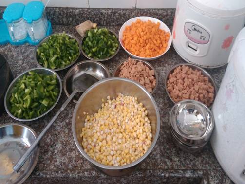 今天后勤组采购人员早早就将一天的食材采购完毕。早上九点左右,后勤组负责做午餐的各成员就已经陆续到位开始准备今天的午餐了。淘米煮饭、洗菜择菜、切菜、打下手......他们每个人都有自己明确的分工职责。做好早期的准备工作后,就要开始炒菜了。今天的菜品主要是炒番薯叶、炒菜心、炒四丁和炒猪肉。其中炒四丁的处理过程比较麻烦,因为要将其中三样食材——圆椒、火腿肠胡萝卜分别切成丁。这就比较考验后勤组人员的刀功了。后勤组人员轮番上阵,一个人切累了就换另一个,经过一番与食材的“搏斗”,炒四丁的食材就准备好了。