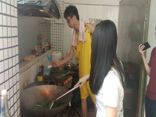 接着就是重头戏——炒菜了。7月的中午气温有些许的高,加上厨房又没有风扇。热,这无疑是对站在煤气炉前面炒菜的后勤组人员的一大考验。一轮的炒菜下来,负责炒菜的同学已经满头大汗。但他们却仍然没有一丝怨言,始终专注于锅中的食材。而放学后的其他同学看后勤组如此辛苦地工作,也自发地帮着后勤组上菜。