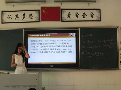 五班的第一节课是黄海静老师的英语课。海静老师在课上设置了一个有趣的环节——老师讲一个英语短语,所有同学要立即做出相应动作。由此,课堂的参与度大大地提高了,同学们在课堂上“动”了起来,置身其中,也就更能理解学习内容了。