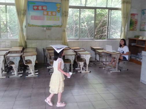 第四关是“走一夏”,需要顶着三本书从一个黑板走向另一个黑板再走回来。每个小朋友或头向后稍仰,用额头顶书,或略微低头,脖子向前伸长,都双手微微左右张开,似天鹅或其他禽类鸟类生物展翅,缓步前进——可惜平衡貌似没有为此增加,该掉的还是会掉,没有掉的在走完后一脸欣喜,哒哒哒地跑去拿通关证明。偶尔有的还会透出迷茫——究竟是怎么走才不掉呢?为什么第一次又掉了呢?