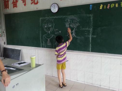 第一关是“摸一夏”——黑板上的画像由我和另一位大触倾情提供,而小朋友们的任务是交叉双手,用在下面的那只手捏着自己的鼻子,弯腰转圈后,再走去黑板处摸由裁判员指定的画像上的五官。当然,转圈的数目由于觉得难度太低,于是由五圈到八圈再到十圈——与之相对应的是小朋友跌跌撞撞的身影越发找不到北来。令人印象深刻的是一个眼睫毛又长又密的小男孩儿,不仅因为长相,还因为转完圈后摇晃得最厉害的就是他,可他仍然欢呼着把手伸到画像的鼻子上——全心全意地享受着游戏。